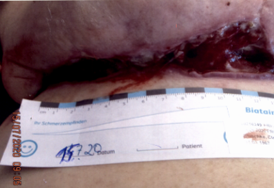 PICO◊ 14 System 15x20 cm in Kombination mit SECURA◊ reizfreier Hautschutz und ACTICOAT◊ FLEX 3 Wundauflage*. Im weiteren Verlauf Therapie ohne ACTICOAT◊ FLEX 3 Wundauflage und Umstellung auf PICO◊ 14 System 10x20 cm. Sobald die Wunde einen positiven Heilungsverlauf aufwies, wurde mit DURAMAX◊ Superabsorbierender Wundauflage und anschließend mit JELONET◊ Salbenkompresse weiterbehandelt.