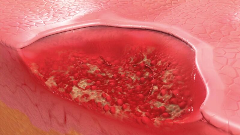 Verzögerte Wundheilung Eine gestörte Immunantwort führt zu einem Teufelskreis von Gewebeschäden und unterschwelligen Entzündungen.Um den Biofilm wirksam zu durchbrechen und die Heilung zu fördern, muss ein antimikrobielles Mittel in die EPS eindringen und die Bakterien mit einer anhaltenden Wirkung angreifen, die eine Neubildung des Biofilms verhindert.